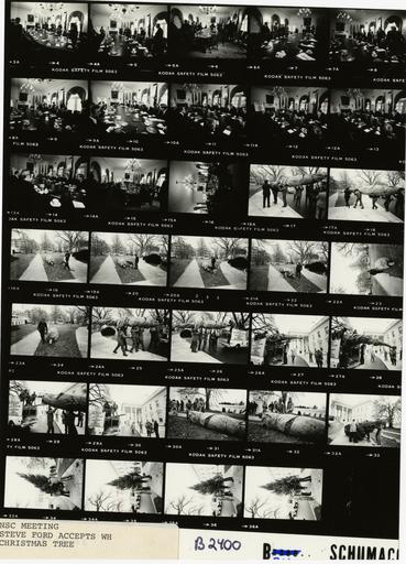 | Keywords: Ford B2400 NLGRF photo contact sheet (1976-10-04)(Gerald Ford Library).jpg White House Photographic Office WHPO is housed at the Gerald R Ford Presidential Library a branch of the National Archives and Records Administration NARA <br/><br/> This file is a 200 dpi photo contact sheet having images from roll of film B2400 of the August 9 1974 - January 20 1977 Gerald R Ford White House Photographic Office Series A0001-A9999 and B0001-B2886 photographs <br/><br/> The date on the photo contact sheet is the date the roll of film was processed not necessarily the date the photographs were taken See table below for additional details 1976-10-04 Gerald R Ford Presidential Library Image http //www fordlibrarymuseum gov/library/whphotos/B2400_NLGRF jpg B2400_NLGRF jpg from http //www fordlibrarymuseum gov/library/whphotos/19761004whpo pdf White House Photographs October 4 1976 of the http //www fordlibrarymuseum gov/Library/whphotos/whpo asp White House Photographic Collection page White House Photographic Office WHPO - Schumacher PD-USGov Institution Institution Gerald R Ford Presidential Library Table wikitable sortable + Photo contact sheet B2400 U S President Ford Administration Gerald R Ford Library Frame s Tone Subject proper Subject generic Names Geographic Location Photographer Date - 4-7 BW Prior to Meeting to Discuss 1978 Defense Budget of the US greeting handshaking standing talking around table; various angles and distances; all not in every frame Marsh Cheney Scowcroft Brig Gen Boverie Lynn P O'Neill Ogilvie McOmber Rumsfeld Martin R Hoffmann Middendorf Reed Gen Brown Gen Rodgers Adm Holloway Gen Jones Gen Wilson Fred wacker Edward Aldridge James Wade Cabinet Room Schumacher 1976-10-04 - 8 BW Prior to Meeting to Discuss 1978 Defense Budget of the US GRF greeting handshaking standing talking; others around table; various angles and distances; all not in every frame GRF Marsh Cheney Scowcroft Brig Gen Boverie Lynn P O'Neill Ogilvie McOmber Rumsfeld Martin R Hoffmann Middendorf Reed Gen Brown Gen Rodgers Adm Holloway Gen Jones Gen Wilson Fred wacker Edward Aldridge James Wade Cabinet Room Schumacher 1976-10-04 - 9-16 BW Meeting to Discuss 1978 Defense Budget of the US seated around around table talking; various angles and distances; all not in every frame GRF Marsh Cheney Scowcroft Brig Gen Boverie Lynn P O'Neill Ogilvie McOmber Rumsfeld Martin R Hoffmann Middendorf Reed Gen Brown Gen Rodgers Adm Holloway Gen Jones Gen Wilson Fred wacker Edward Aldridge James Wade Cabinet Room Schumacher 1976-10-04 - 17-18 BW Arrival of the 1976 White House Christmas Tree removing Christmas tree from bed of truck Federal Protective Officer National Park Service Workers North Lawn Schumacher 1976-10-04 - 19-24 BW Arrival of the 1976 White House Christmas Tree standing guarding Christmas Tree Federal Protective Officer Dog North Lawn Schumacher 1976-10-04 - 25-26 BW Arrival of the 1976 White House Christmas Tree putting Christmas tree from bed of truck Federal Protective Officer National Park Service Workers North Lawn Schumacher 1976-10-04 - 27-30 BW Arrival of the 1976 White House Christmas Tree - Photo Opportunity for Steve Ford removing Christmas tree from bed of truck Steve Ford National Park Service Workers North Lawn Schumacher 1976-10-04 - 31-32 BW Arrival of the 1976 White House Christmas Tree standing near tree removing wrapping; tree lying on ground Steve Ford Unidentified Man North Lawn Schumacher 1976-10-04 - 33-37 BW Arrival of the 1976 White House Christmas Tree raising tree on end; no tree stand visible Steve Ford National Park Service Workers North Lawn Schumacher 1976-10-04 Gerald R Ford Presidential Library and Museum-cooperation PD-USGov Contact sheets by the Ford White House October 1976 |