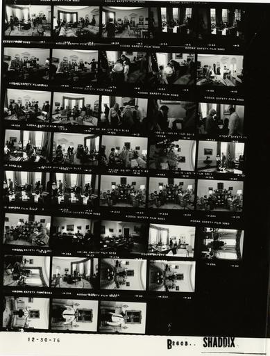 | Keywords: Ford B2603 NLGRF photo contact sheet (1976-12-30)(Gerald Ford Library).jpg White House Photographic Office WHPO is housed at the Gerald R Ford Presidential Library a branch of the National Archives and Records Administration NARA <br/><br/> This file is a 200 dpi photo contact sheet having images from roll of film B2603 of the August 9 1974 - January 20 1977 Gerald R Ford White House Photographic Office Series A0001-A9999 and B0001-B2886 photographs <br/><br/> The date on the photo contact sheet is the date the roll of film was processed not necessarily the date the photographs were taken See table below for additional details 1976-12-30 Gerald R Ford Presidential Library Image http //www fordlibrarymuseum gov/library/whphotos/B2603_NLGRF jpg B2603_NLGRF jpg from http //www fordlibrarymuseum gov/library/whphotos/19761230whpo pdf White House Photographs December 30 1976 of the http //www fordlibrarymuseum gov/Library/whphotos/whpo asp White House Photographic Collection page White House Photographic Office WHPO - Shaddix PD-USGov Institution Institution Gerald R Ford Presidential Library Table wikitable sortable + Photo contact sheet B2603 U S President Ford Administration Gerald R Ford Library Frame s Tone Subject proper Subject generic Names Geographic Location Photographer Date - 0A-21A BW White House Tour for Gayle Ford's Family standing talking looking at artifacts sitting in GRF's chair; various angles and distances; all not in every frame Gayle Ford Gayle's Family Oval Office Shaddix 1976-12-30 - 22A-25A BW White House Tour for Gayle Ford's Family seated standing posing in front of fireplace; entire group shot Gayle Ford Gayle's Family Oval Office Shaddix 1976-12-30 - 26A-27A BW White House Visitors seated posing at table Unidentified Couple Roosevelt Room Shaddix 1976-12-30 - 28A-33A BW White House Visitors walking into office standing posing behind desk Unidentified Couple Oval Office Shaddix 1976-12-30 - 34A-37 BW standing posing in front of fireplace Unidentified FPS Officer Oval Office Shaddix 1976-12-30 Gerald R Ford Presidential Library and Museum-cooperation PD-USGov Contact sheets by the Ford White House December 1976 |