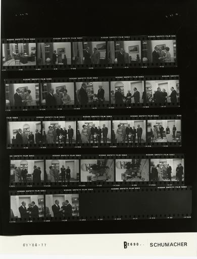 Keywords: Ford B2690 NLGRF photo contact sheet (1977-01-06)(Gerald Ford Library).jpg White House Photographic Office WHPO is housed at the Gerald R Ford Presidential Library a branch of the National Archives and Records Administration NARA <br/><br/> This file is a 200 dpi photo contact sheet having images from roll of film B2690 of the August 9 1974 - January 20 1977 Gerald R Ford White House Photographic Office Series A0001-A9999 and B0001-B2886 photographs <br/><br/> The date on the photo contact sheet is the date the roll of film was processed not necessarily the date the photographs were taken See table below for additional details 1977-01-06 Gerald R Ford Presidential Library Image http //www fordlibrarymuseum gov/library/whphotos/B2690_NLGRF jpg B2690_NLGRF jpg from http //www fordlibrarymuseum gov/library/whphotos/19770106whpo pdf White House Photographs January 6 1977 of the http //www fordlibrarymuseum gov/Library/whphotos/whpo asp White House Photographic Collection page White House Photographic Office WHPO - Schumacher PD-USGov Institution Institution Gerald R Ford Presidential Library Table wikitable sortable + Photo contact sheet B2690 U S President Ford Administration Gerald R Ford Library Frame s Tone Subject proper Subject generic Names Geographic Location Photographer Date - 8 BW seated at desk looking towards door GRF Oval Office Schumacher 1977-01-06 - 9-11 BW Counsel Voegelin Barton Law Firm - Meeting to Congratulate Mr Mrs Hillings on His Marriage greeting handshaking embracing GRF Patrick Hillings Oval Office Schumacher 1977-01-06 - 12-14 BW Counsel Voegelin Barton Law Firm - Meeting to Congratulate Mr Mrs Hillings on His Marriage greeting handshaking standing posing GRF Mr Mrs Patrick Hillings Oval Office Schumacher 1977-01-06 - 15-18 BW Counsel Voegelin Barton Law Firm - Meeting to Congratulate Mr Mrs Hillings on His Marriage greeting handshaking standing talking; all not in every frame GRF Members of Hillings Family Oval Office Schumacher 1977-01-06 - 19-21 BW Counsel Voegelin Barton Law Firm - Meeting to Congratulate Mr Mrs Hillings on His Marriage standing posing GRF Mr Mrs Patrick Hillings Members of Hillings Family Oval Office Schumacher 1977-01-06 - 22-27 BW Counsel Voegelin Barton Law Firm - Meeting to Congratulate Mr Mrs Hillings on His Marriage standing talking; various angles and distances; all not in every frame GRF Mr Mrs Patrick Hillings Members of Hillings Family Oval Office Schumacher 1977-01-06 - 28-29 BW standing talking GRF Unidentified Man Woman Oval Office Schumacher 1977-01-06 Gerald R Ford Presidential Library and Museum-cooperation PD-USGov Contact sheets by the Ford White House January 1977 |