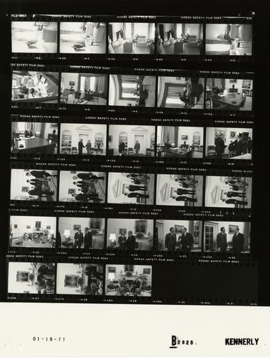 | Keywords: Ford B2825 NLGRF photo contact sheet (1977-01-18)(Gerald Ford Library).jpg White House Photographic Office WHPO is housed at the Gerald R Ford Presidential Library a branch of the National Archives and Records Administration NARA <br/><br/> This file is a 200 dpi photo contact sheet having images from roll of film B2825 of the August 9 1974 - January 20 1977 Gerald R Ford White House Photographic Office Series A0001-A9999 and B0001-B2886 photographs <br/><br/> The date on the photo contact sheet is the date the roll of film was processed not necessarily the date the photographs were taken See table below for additional details 1977-01-18 Gerald R Ford Presidential Library Image http //www fordlibrarymuseum gov/library/whphotos/B2825_NLGRF jpg B2825_NLGRF jpg from http //www fordlibrarymuseum gov/library/whphotos/19770118whpo pdf White House Photographs January 18 1977 of the http //www fordlibrarymuseum gov/Library/whphotos/whpo asp White House Photographic Collection page White House Photographic Office WHPO <br/> Creator David Hume Kennerly PD-USGov Institution Institution Gerald R Ford Presidential Library Table wikitable sortable + Photo contact sheet B2825 U S President Ford Administration Gerald R Ford Library Frame s Tone Subject proper Subject generic Names Geographic Location Photographer Date - 2-6 BW Last-Minute Packing of Ford Material Prior to Transition to President Jimmy Carter Usher standing leaning on wall hand propping head; man packing boxes; various angles and distances; both not in every frame White House Usher Unidentified Man Second Floor - President's Bedroom Kennerly 1977-01-18 - 7 BW Last-Minute Packing of Ford Material Prior to Transition to President Jimmy Carter seated at desk talking on telephone; boxes stacked in background Unidentified Woman Unidentified White House Office Kennerly 1977-01-18 - 8-12 BW GRF seated at desk working; O'Donnell leaning forward in 3rd fame only; various angles and distances GRF O'Donnell Oval Office Kennerly 1977-01-18 - 13-14 BW Meeting with US Representative from Louisiana LA greeting handshaking walking toward desk GRF Rep Waggonner Oval Office Kennerly 1977-01-18 - 15 BW Meeting with US Representative from Louisiana LA seated at desk talking GRF Rep Waggonner Oval Office Kennerly 1977-01-18 - 16-21 BW Meeting with US Senator from Oregon OR greeting handshaking standing talking posing; all not in every frame GRF Sen Packwood; Georgie Packwood Billy Shyla Packwood Oval Office Kennerly 1977-01-18 - 22 BW Meeting with Correspondent Christian Science Monitor seated near fireplace talking; long shot; woman's back to camera GRF Godfrey Sperling Nessen Unidentified Woman Oval Office Kennerly 1977-01-18 - 23-24 BW Meeting with Correspondent Christian Science Monitor standing talking laughing GRF Godfrey Sperling Oval Office Kennerly 1977-01-18 - 25-26 BW Meeting with Chairman Republican National Committee RNC standing talking GRF William Brock Oval Office Kennerly 1977-01-18 - 27-29 BW Meeting with Chairman Republican National Committee RNC seated talking near fireplace GRF William Brock Oval Office Kennerly 1977-01-18 Gerald R Ford Presidential Library and Museum-cooperation PD-USGov Contact sheets by the Ford White House January 1977 Photographs by David Hume Kennerly from 1977 |