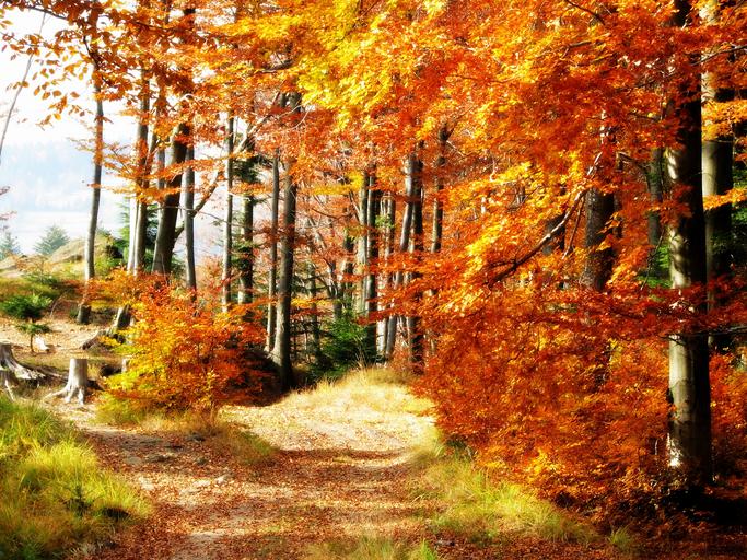 Keywords: forest autumn beeches tree mountains way the sun beskids poland colorful nature