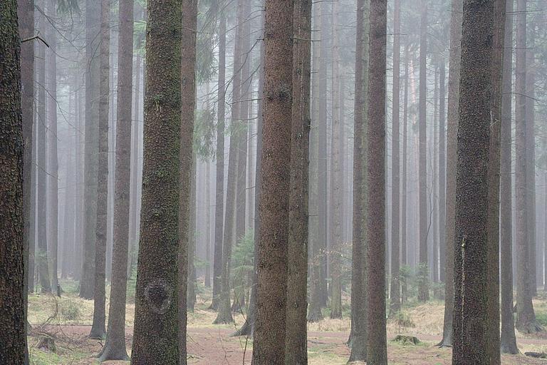 Keywords: forest fir forest autumn nebenl trees tree trunks winter nature romantic frosty