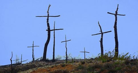 Keywords: forest fire burnt mountain degradation death artistic crosses firewood burned