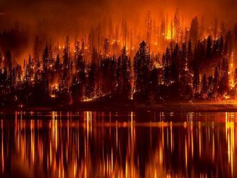 Keywords: forest fire flames burning water reflection smoke trees orange blaze hot disaster outdoors nature wildfire wood destruction damage night wilderness landscape