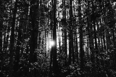 Keywords: forest flare wood trunks trees nature sunshine through light outdoor vegetation black and white