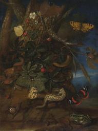 | Keywords: Forest floor still life with lizards.jpg Artwork en Forest floor still life with lizards butterflies a toad a snail a snake a dragonfly a beetle an ant a worm and a ladybug oil on canvas Size cm 30 2 22 6 object history exhibition history credit line place of creation PD-old-100 http //www sothebys com/en/auctions/ecatalogue/2014/old-master-paintings-n09161/lot 13 html accession number Uploaded with UploadWizard Still life paintings Karl Wilhelm de Hamilton | ||||