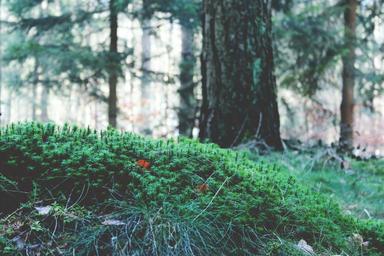 Keywords: forest hill landscape winter nature green trees cold moss hilly tree trunks
