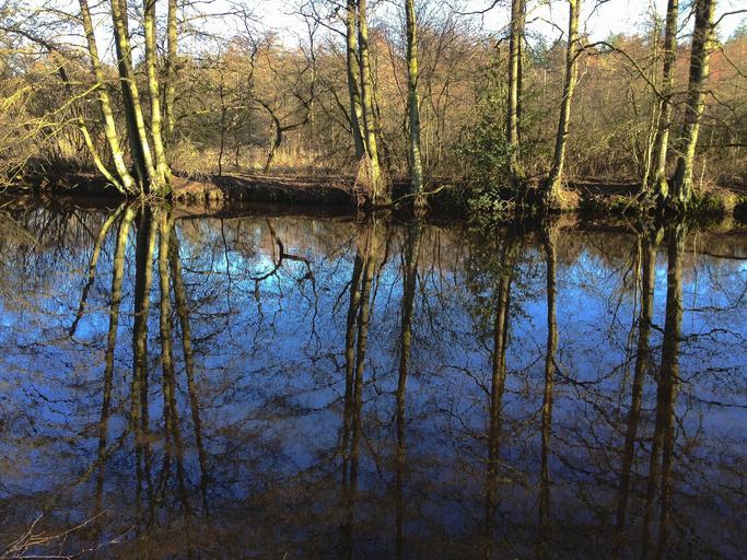 Keywords: forest mirroring river water spring trees tree trunks nature