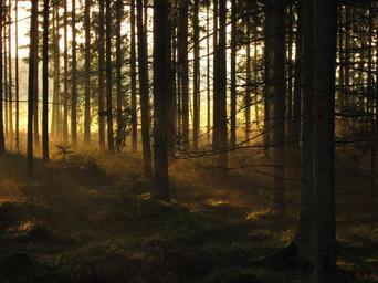 Keywords: forest spruce trees sunrise morning woods coniferous environment flora