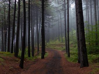 Keywords: forest trees fog nature landscape trail mountain water tree green trunk walk into the woods