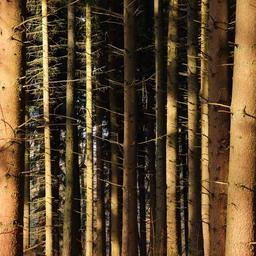 Keywords: forest trees tree trunks coniferous forest conifers sunlight pattern background symmetry symmetrical