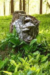 Keywords: forest woods lilies of the valley woodland stump burls trees sunny day summer face ghost