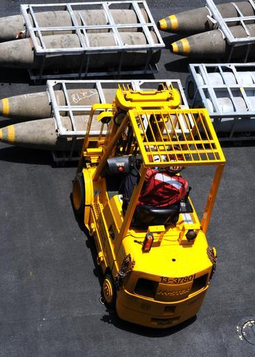 Keywords: Forklift is moving bombs.jpg A fork-lift operator from aircraft elevator 4 picks up ordnance during a weapons onload aboard the aircraft carrier USS Dwight D Eisenhower CVN 69 http //www navy mil; http //www navy mil/view_image asp id 72282 VIRIN 090529-N-9988F-286 Rafael Figueroa Medina U S Navy 2009-05-25 PD-USGov-Military-Navy Hyster forklifts Aboard USS Dwight D Eisenhower CVN-69 Practice bombs Military forklifts |