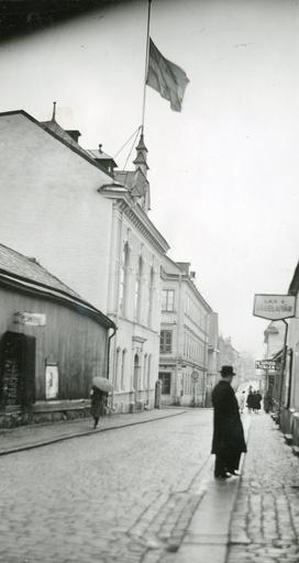 Keywords: outdoor Flagging på halv stang fra Smålands Nation i Uppsala i anledning arresteringen av Oslostudentene. S 1017 Flagging på halv stang fra Smålands Nation i Uppsala i anledning arresteringen av Oslostudentene. S 1017
