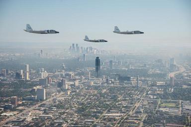 Keywords: NASA three WB-57s fly aircraft foggy downtown Houston Texas historic formation flight