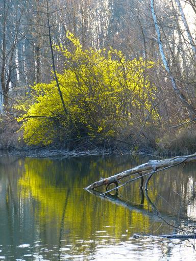 Keywords: forsythia bloom yellow flowers ornamental shrub spring water mirroring garden forsythia gold lilac golden bells forsythia flowers