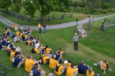 | Keywords: Fort Meade chiefs tour Antietam National Battlefield 140830-N-ZI955-063.jpg en Keith Snyder an Antietam National Battlefield park ranger and a native of Martinsburg W Va discusses the historical significance of the Battle of Antietam with Fort Meade chiefs and their FY15 chief selectees Aug 30 2014 The Fort Meade chiefs conducted a heritage visit to Antietam National Battlefield and took a guided tour of the battlegrounds The Battle of Antietam took place Sept 17 1862 and is often referred to as the bloodiest single-day battle in American history More than 23 000 soldiers were killed wounded or left missing in the wake of this 12-hour battle U S Navy photo by Senior Chief Mass Communication Specialist Daniel Sanford/Released 2014-08-30 Senior Chief Petty Officer Daniel Sanford https //www dvidshub net/image/1530459 140830-N-ZI955-063 2014-09-01 10 43 SHARPSBURG MD US PD-USGov-Military-Navy Fort Meade Images from DoD uploaded by Fæ |