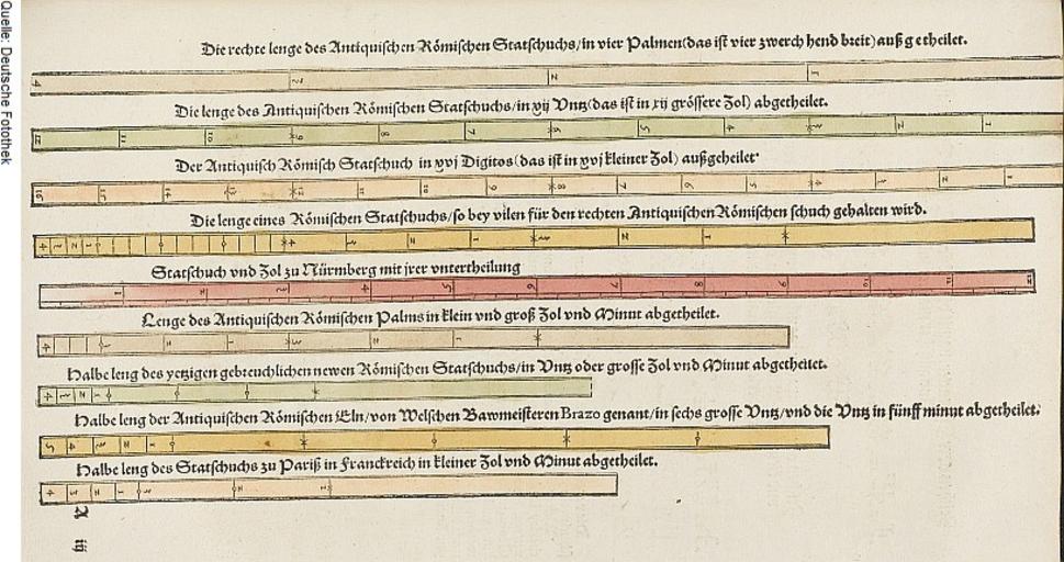 | Keywords: Fotothek df tg 0000160 Messinstrumente ^ Maß ^ Maßstab.jpg  Scan Deutsche Fotothek df_tg_0000160 color 2007 MIK-Center Berlin GmbH 88960160 251r Nürnberg Vergleich von Maßeinheiten Papier Holzschnitt koloriert 30 x 14 cm Messinstrumente Maß Maßstab ppn263566811 1547 Druck Deutsche Fotothek gefördert von der Deutschen Forschungsgemeinschaft Projekt Technikgeschichte 16 /17 Jh Verwalter Dresden Sächsische Landesbibliothek - Staats- und Universitätsbibliothek Dresden Optica 31 Herstellung Petrejus Johann Drucker aus Ryff Walther Hermann Buch Der furnembsten notwendigsten der gantzen Architectur angehoerigen Mathematischen und Mechanischen kuenst eygentlicher bericht und vast klare verstendliche unterrichtung zu rechtem Verstandt der lehr Vitruvij in drey furneme Buecher abgetheilet Nürnberg Petreius 1547 Das drit Buch/ der klaren und verstendlichen unterweisung der f\eurnembsten not wendigsten/ der gantzen Architectur angeh\eorigen Mathe matischen und Mechanischen k\eunst/ Der geometrischen messung Eigentliche abtheilung mancherley Meßstab und Waffen/ so man zu der Geometrischen Messung braucht zu gemeiner einleitung volgender unterrichtung von mancherlen kunstlicher Mathematischer messung SLUB Optica 31 Fotothek-License PD-old-100 Architectur by Walther Hermann Ryff Ell Units of length |