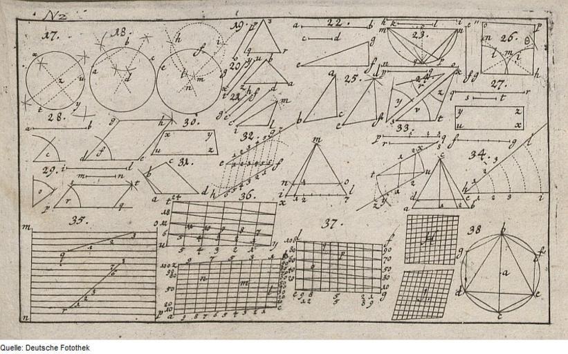 | Keywords: Fotothek df tg 0000219 Geometrie ^ Kreis ^ Dreieck ^ Viereck ^ Polygon ^ Instrument ^ Proportion.jpg Scan Deutsche Fotothek df_tg_0000219 color 2007 MIK-Center Berlin GmbH 88960219 Abbildung Nr 2 Nürnberg Konstruktion von Kreismittelpunkten Dreiecken Vierecken und Polygonen mit dem Zirkel Proportionale Streckenteilung Papier Kupferstich 8 7 x 14 5 cm Geometrie Kreis Dreieck Viereck Polygon Instrument Proportion ppn263671577 1687 Druck Deutsche Fotothek gefördert von der Deutschen Forschungsgemeinschaft Projekt Technikgeschichte 16 /17 Jh Verwalter Dresden Sächsische Landesbibliothek - Staats- und Universitätsbibliothek Dresden 3 A 8395 Herstellung Herstellung Riegel Christoph Knorz Andreas Verleger aus Stahl Georg Conrad Buch Georg Conrad Martii neu-aufgeführter Europäischer Ingenieur oder Kriegs-Bau-Kunst Wie solche mit allem was dazu erfordert wird in Europa üblich gewesen und zumaln annoch ist In sich haltend I Eine vollständige Geometrie II Eine ausführliche Fortification nemlich von Offensiv- und Defensiv-Wercken auch andern Militair-Gebäuden auf aller Europäischen Völcker Art vorgestellt und mit nöthigen Kupffern versehen Das II Capitel Von der Planigraphie oder Uffreissung der Figuren Das III Capittel Von Theilungen der Linien/ und zwar Erstlich der Geraden Das IV Capitel Von Theilungen der Circular-Linie/ oder/ worauf es folglich zu ziehen/ von Aufreissung der Polygonal oder vielseitigen Figur SLUB 3 A 8395 Fotothek-License PD-old-100 Old Manuscripts from the Deutsche Fotothek Geometrie Stereometrie Körper |