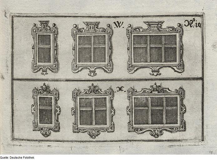 | Keywords: Fotothek df tg 0002972 Architektur ^ Fenstereinfassung ^ Fensterrahmen ^ Fenster ^ Gesims.jpg  Scan Deutsche Fotothek df_tg_0002972 color 2007 MIK-Center Berlin GmbH 88962972 zwischen S 30 und 31 Blatt Nr 10 Augsburg Fenstereinfassungen unterhalb des Dachgesimses und Verkleidungen Papier Kupferstich 8 8 x 13 cm Architektur Fenstereinfassung Fensterrahmen Fenster Gesims ppn266930085 1667 Druck Deutsche Fotothek gefördert von der Deutschen Forschungsgemeinschaft Projekt Technikgeschichte 16 /17 Jh Verwalter Dresden Sächsische Landesbibliothek - Staats- und Universitätsbibliothek Dresden Archit 595-8/9 misc 2 Herstellung Schultes Johann Drucker Herstellung Furttenbach Joseph der Jüngere Kupferstecher aus Furttenbach Joseph Buch Allgemeine deutsche Baukunst Garten-Pallästlins-Gebäw; Der Neundte Theil; in welchem gar umständlich zu vernehmen wie ein Lust- Sommer- oder Villa-Haus im freyen Feld dastehend einem Garten-Pallästlin zu vergleichen auch mancherley feinen Architectonischen mit geringen Unkosten in das Werck selbsten zustellenden albereit experimentirten liebreichen Zieraden köndte aufgebauet und alsdann zu Nutzen und Recreation möge gebraucht und gaudirt werden Von den Fenster-Gerichter Das Kupfferblat N 10 SLUB Archit 595-8/9 misc 2 Fotothek-License PD-old-100 Joseph Furttenbach d J Old Manuscripts from the Deutsche Fotothek |