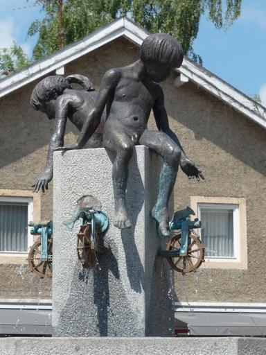 Keywords: fountain freilassing downtown pedestrian zone sculpture boy girl waterwheel water feature