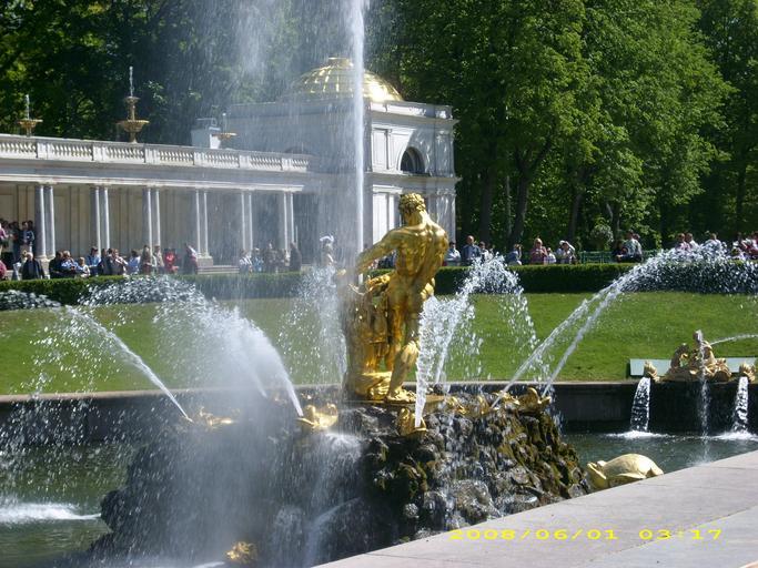 Keywords: Fountain peterhof.jpg en A fountain on the main stairway leading into the interior of the gardens at Peterhof These gardens were inspired by a trip by the Czar Peter to Versailles Sampson Fountain Pavilions in Peterhof