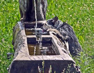 Keywords: fountain thirst terrier water jet log hollowed out alpine alpine region meadow summer meadow clover flower water drink tongue slurp bitch trixie mountain summer