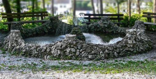 Keywords: fountain water stone stone wall pump background wall leaves natural stone wall old large forest nature photo