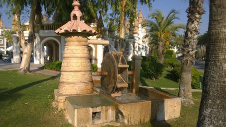 Keywords: fountain waterwheel water palm building away meadow grass sky plant tree water mill