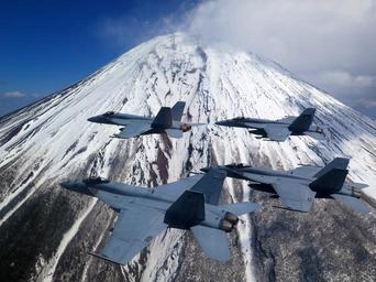 Keywords: Four F-A-18E Super Hornets flying near Mt. Fuji (150325-N-ZZ999-001).jpg NEAR MT FUJI March 25 2015 Four F/A-18E Super Hornets from the Atsugi Japan-based VFA-27 Royal Maces fly near Mt Fuji The Royal Maces conduct carrier based air strike and strike force escort missions anti-ship operations battle group anti-air operations and surveillance/intellighence collection operations in support of Carrier Air Wing CVW 5 tasking and requirements The squadron is permanently forward-deployed with CVW 5 shore based at Naval Air Facility Atsugi and currently embarked on the Nimitz-class aircraft carrier USS George Washington CVN 73 U S Navy photo by Cmdr Spencer Abbot https //www flickr com/photos/us7thfleet/19306490693/ 150325-N-ZZ999-001 2015-03-25 12 54 Cmdr Spencer Abbot PD-USGov-Military-Navy F/A-18E Super Hornet in flight Strike Fighter Squadron 27 United States Navy Aerial photographs of Mount Fuji Aircraft with Mount Fuji
