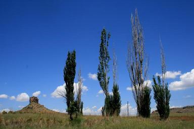 Keywords: four poplars tall scragly thin veld outcrop sky clouds countryside