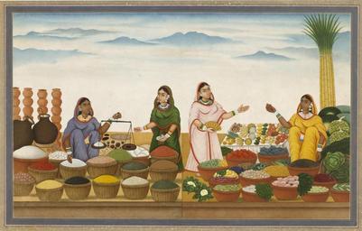 | Keywords: Four women selling food-grains, vegetables and fruit.jpg en The pictures made by Indian artists for the British in India are called Company paintings The artist Shiva Dayal Lal who worked in Patna created this one around 1850 He relied to a great extent on patronage from the local gentry especially Rai Sultan Bahadur for whom he made bird and flower paintings His cousin Shiva Lal also ran an artist's shop in Patna but his work tends to be less brightly coloured and precise in style circa 1850 made http //collections vam ac uk/item/O68297/painting-four-women-selling-food-grains/ Shiva Dayal Lal born 1815 - died 1884 artist PD-Art Uploaded with UploadWizard Company style Paintings of India in the Victoria and Albert Museum Markets in Bihar Paintings of women of India Markets in art Fruit markets in India 1850s paintings from India Shiva Lal |
