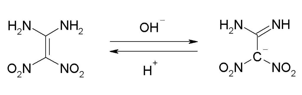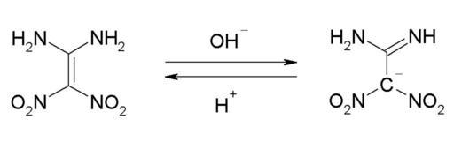 Keywords: FOX-7 protolysis equilibrium.png Protolysis equilibrium of diaminodinitroethylene FOX-7 Protolysegleichgewicht von Diaminodinitroethylen FOX-7 Own Steffen 962 2009-08-20 Acid-base reactions Chemical equilibria Primary amines FOX-7