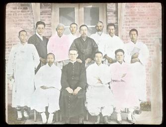 | Keywords: Fr. John E. Morris, MM, and eleven Korean men, Korea, ca. 1930-1936 (MFB-LS0488).jpg en <br> Group portrait of Fr John E Morris MM and eleven Korean men Korea ca 1920/1940 Colorized lantern slide of Fr John E Morris MM with eleven Korean men Fr Morris wears a cassock and glasses He is one of four men seated in the front row The two men to his left have their arms crossed over their chests Standing in the back row on the right hand side is a man holding a book The group poses in front of the door to a brick building Photographer Unknown Subject keyword indigenous peoples; clergy; group portraits Filename MFB-LS0488 Coverage date circa 1920/1940 Subject unesco indigenous peoples; clergy Part of collection International Mission Photography Archive ca 1860-ca 1960 Type images Part of subcollection Photographs of the Catholic Foreign Mission Society of America Maryknoll New York 1912-1945 Part of repository Maryknoll Mission Archives Repository name Maryknoll Mission Archives Archival file impa_Volume32/MFB-LS0488 tiff Repository address Maryknoll Mission Archives PO Box 305 Maryknoll N Y 10545-0305 Geographic subject country Korea Geographic subject continent Asia Rights http //www maryknollsociety org/index php/articles/2-articles/593 Repository email archives maryknoll org Date created circa 1920/1940 Publisher of the digital version University of Southern California Libraries Format aat lantern slides Legacy record ID impa-m60807 Access conditions http //www maryknollsociety org/index php/articles/2-articles/593 File MFB/LanternSlides/LS0488 1930 1936 http //maryknollmissionarchives org/index php/history/1029-morrisfrjohne author http //digitallibrary usc edu/cdm/ref/collection/p15799coll123/id/11456 PD-Japan-oldphoto PD-Old-70 Magic lantern images Images from USC Digital Library uploaded by Fæ International Mission Photography Archive ca 1860-ca 1960 Indigenous peoples Clergy |