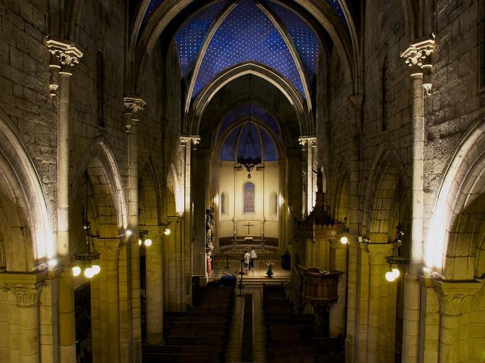 Keywords: france church interior architecture faith religion catholic lights somber quiet stone columns
