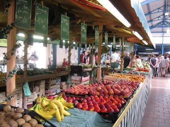 Keywords: france market fruit food bananas peaches apricots stall french