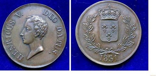 | Keywords: France Pretender Bronze Coin 5 Fr 1831 Henri V.jpg en D 37 mm Henri V Count of Chambord 1820 Paris - 1883 Frohsdorf Austria Child head l around HENRICUS V DEO DATUS / Crowned French shield in wreath date below Gadoury 346; KM X 33 previous KM PT 33 Condition UNCIRCULATED 1831-08-31 own Berlin-George other versions cc-by-sa-4 0 This photo PD-1923 PD-EU-no author disclosure Medals of France Henri Count of Chambord | ||||