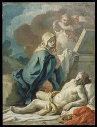 | Keywords: Francesco de Mura - Pietà - Walters 371125.jpg Walters Art Museum artwork Q18748496 Creator Francesco de Mura A Pietà meaning compassion in Italian is the image of the Virgin Mary mourning her dead son In the Bible she mourns along with others Isolating her focuses the viewer's attention on her suffering and her compassion for her son's suffering thereby offering the ultimate example for pious Catholics The idealized muscular body of the dead Christ is set off against the stately pyramidal figure of Mary in her voluminous robe and presented to the viewer so that he or she like the Virgin Mary can meditate on Christ's sacrifice The silvery tones like the ahistorical setting lend an aura of timelessness to the subject Zeri Italian paintings in the Walters Art Gallery 437 549 ca 1725 1730 Baroque Oil on canvas Painted surface cm 64 49 3 accession number 37 1125 7018 Don Marcello Massarenti Collection Rome date and mode of acquisition unknown 1897 catalogue no 165 as Guido Reni Henry Walters city Baltimore Walters Art Museum Henry Walters Acquired by Henry Walters with the Massarenti Collection 1902 place of origin Naples Italy Walters Art Museum license 2D Baroque paintings in the Walters Art Museum Francesco de Mura Media contributed by the Walters Art Museum needs category review |