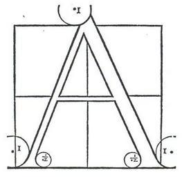 | Keywords: Francesco Torniello da Novara Letter A 1517.jpg Template Serie latin letters Letter A as designed and published by Francesco Torniello da Novara Opera del modo de fare le littere maiuscole antique Gotardo da Ponte Milano 1517 Associated text describing the construction of the letter A Questa littera A si cava del quadro La gamba da man drita vol essere grossa de le none parte l'una de l'alteza vol principiar fora del quadro; insino che si giongia con lo tondo a unità de mezo puncto manco del mezo de la superiore linea versa man sinistra finisca sopra lo angulo extremo del quadro con quelli tondi como vedi contrascripto E tutti li tondi de fora sono larghi uno puncto quelli de dentro mezo cioè dal mezo del tondo infino a la circunferentia La gamba sinistra vol essere la mittà de la gamba grossa la interiore linea de dicta gamba vol principar nel mezo de la suprema linea del quadro finire a unità de la extrema uno puncto dentro de la linea sinistra del quadro La gamba de mezo vol essere la terza parte de la gamba grossa giungendo la superiore linea de dicta gamba sopra la linea transversale del quadro Note Francesco Torniello works with a 18x18 square grid 81 x 81 mm where one point is one ninth of the square length i e 9 mm PD-old Font design by Francesco Torniello A Location not applicable |