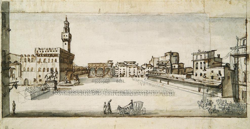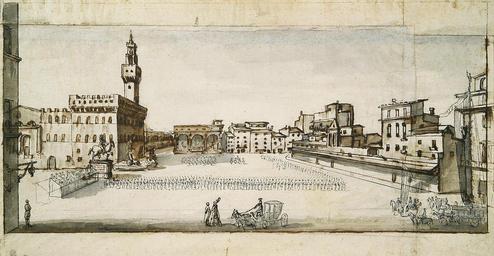 | Keywords: Francesco Zucchi (attr) Piazza della Signoria in Florenz.jpg Piazza della Signoria in Florenz mit einer Militärparade Feder in Schwarz braun und grau laviert auf Bütten 20 5 x 38 cm http //www dorotheum com Dorotheum century 18 attributed to Francesco Zucchi 1692-1764 PD-art-100 Images from Dorotheum Florence in art Historical images of Piazza della Signoria | ||||