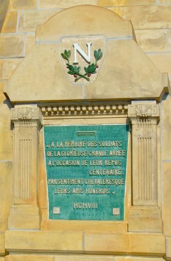 | Keywords: Francia emlékmű felÃrat.JPG hu A pécsi francia emlékmű francia nyelvű emléktáblája felÃrat The plaque reads In memoriam the soldats of the Glorious Grande Armée Grand Army in occasion of their 100-year repose <br>With chevalric emotions “ Their hungarian friends « A la mémoire des soldats de la glorieuse Grande Armée à l'occasion de leur repos centenaire Par sentiment chevaleresque leurs amis hongrois » photo by uploader 2008 architect Andor Pilch ; sculptor Sándor Apáti Abt 1908 Battle of GyÅ‘r 1809 French inscriptions in Hungary Zsolnay ceramics Monuments and memorials in Pécs |