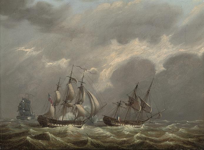 | Keywords: Francis Sartorius - His Majesty's frigate Clyde capturing the French frigate Vestale.jpg His Majesty's frigate šClyde ˜ capturing the French frigate šVestale ˜ whilst the French corvette šSagesse ˜ engages at long range 20th August 1799 oil canvas cm 22 8 29 8 object history credit line At 8 30am on 20th August 1799 the 38-gun British frigate Clyde Captain Charles Cunningham was cruising near the Cordovan lighthouse off Rochefort when she sighted two ships to the south-west Captain Cunningham gave chase immediately and by 11 00am had recognised both vessels as French When the two enemy ships separated soon afterwards Cunningham decided to go after the larger which when he caught up with her at 1 30pm revealed herself as the 36-gun frigate Vestale After a spirited action lasting almost two hours during which the Frenchman put up a gallant fight despite sustaining serious damage to her sails and rigging as well as to her hull below the water-line Vestale struck her colours and surrendered <br/> Throughout the engagement however the other enemy vessel the 20-gun corvette Sagesse stood off inshore and apart from firing a few desultory rounds did nothing to assist her consort Once Vestale surrendered Sagesse immediately crammed on more sail and fled the scene to take refuge in the Gironde estuary where Captain Cunningham wisely declined to follow In the event the captured Vestale was deemed too badly damaged to be assimilated into the Royal Navy but Captain Cunningham was nevertheless congratulated by his superiors for what was widely perceived as his classic 'textbook' action <ref>http //www christies com/lotfinder/LotDetailsPrintable aspx intObjectID 5127580 christies com</ref> reflist accession number Christie's online 5127580 PD-old-100 Francis Sartorius 18th-century sailing ships in paintings Sailing ships of the United Kingdom Sailing ships of the Royal Navy |