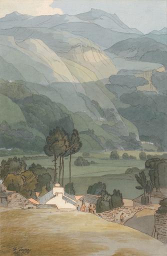 | Keywords: Francis Towne - Ambleside - Google Art Project.jpg Inscribed in black ink lower left F Towne del 1786 No 2 ; in graphite verso upper center Morning light from the right hand ; in brown ink upper left No 2 ; in brown ink upper center Ambleside August 7th 1786 ; in brown ink in docket on old mount verso No 2 Ambleside drawn on the spot by Francis Towne August 7th 1786 Inscription _Marks Watermark Fleur-de-lis similar to Heawood 1829 Inscription _Signed_and_Dated Signed and dated in black ink lower left F Towne del 1786 No 2 Not on View Watercolor and brown and gray ink over graphite on medium slightly textured cream laid paper people village hills trees landscape special url_id UQHO_SZx9qvihQ PD-old-100-1923 1816 Francis Towne Google Art Project works by Francis Towne Paintings in the Yale Center for British Art |