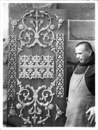 | Keywords: Franciscan monk standing by an intricately decorated wooden panel at Mission Santa Barbara, California, ca.1901-1908 (CHS-4067).jpg en <br> Franciscan monk standing by an intricately decorated wooden panel at Mission Santa Barbara California ca 1901-1908 Photograph of a Franciscan monk standing by an intricately decorated wood panel at Mission Santa Barbara California ca 1901-1908 To the right the monk can be seen wearing a craftsman's apron over his cassock The panel leans against an exterior wall of mortared stone Symmetric floral designs cover the front of the panel The wood panel is the wood-carver's own work Call number CHS-4067 Legacy record ID chs-m16576; USC-1-1-1-14095 Photographer James George Wharton Filename CHS-4067 Coverage date circa 1901/1908 Part of collection California Historical Society Collection 1860-1960 Type images Geographic subject city or populated place Santa Barbara Repository name USC Libraries Special Collections Accession number 4067 Microfiche number 1-144-70 Archival file chs_Volume96/CHS-4067 tiff Part of subcollection Title Insurance and Trust and C C Pierce Photography Collection 1860-1960 Repository address Doheny Memorial Library Los Angeles CA 90089-0189 Geographic subject country USA Format aacr2 3 photographs glass photonegative photoprints b w ; 22 x 17 cm Rights Digitally reproduced by the USC Digital Library; From the California Historical Society Collection at the University of Southern California Subject adlf religious facilities Project USC Repository email specol usc edu Contributing entity California Historical Society Date created circa 1901/1908 Publisher of the digital version University of Southern California Libraries Format aat photographic prints; photographs Geographic subject state California Subject file heading Mission Santa Barbara Format glass plate negatives Access conditions Send requests to address or e-mail given Phone 213 821-2366; fax 213 740-2343 Geographic subject county Santa Barbara Subject lcsh Missions Spanish; Architecture Spanish colonial; Churches Catholic Subject Santa Barbara Mission; Mission Santa Barbara circa 1901 /1908 date created James George Wharton http //digitallibrary usc edu/cdm/ref/collection/p15799coll65/id/16513 PD-old-70-1923 Images from USC Digital Library uploaded by Fæ California Historical Society Collection 1860-1960 Glass plate negatives Photographs by George Wharton James Mission Santa Barbara |