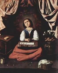 | Keywords: Francisco de Zurbarán 008.jpg Artwork Q6163639 Creator Francisco de Zurbarán ca 1630 Oil Canvas cm 117 94 Institution Metropolitan Museum of Art New York City accession number object history credit line The Yorck Project 10 000 Meisterwerke der Malerei DVD-ROM 2002 ISBN 3936122202 Distributed by DIRECTMEDIA Publishing GmbH http //mail wikipedia org/pipermail/wikide-l/2005-April/012195 html PD-old-100 PD-Art-YorckProject Praying Mary Baroque paintings from Spain Baroque paintings of women Oil paintings of women Portrait paintings of sitting women Women with books in art Portrait paintings of females with flowers 1630s paintings from Spain Spanish paintings in the Metropolitan Museum of Art Baroque paintings in the United States Virgin by Zurbaran Paintings of Childhood of Virgin Mary Females looking up in art 1630s oil on canvas paintings in the United States 17th-century religious paintings in the United States Paintings of Virgin Mary in the United States Child Virgin Mary learning needlework Paintings of ceramics by Zurbarán |