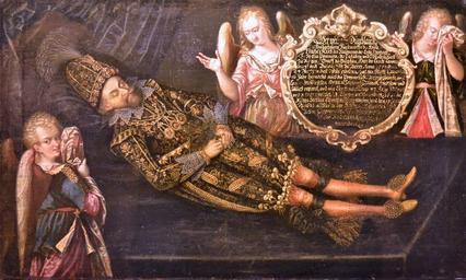 | Keywords: Franciszek I na marach.jpg Pomerania 1620 oil canvas Merseburg Cathedral accession number object history credit line The Duke's hat and jewelled hat-pin depited in the painting is on display in the National Museum in Szczecin Image taken during temporary exhibition in the National Museum in Szczecin own Copyright expired PD-Art PD-old-100 DEFAULTSORT 1620; Francis I of Pomerania Art of Pomerania Merseburg Cathedral Francis I of Pomerania 1620s portrait paintings Deathbed portraits | ||||