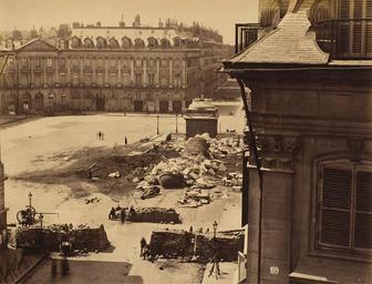 | Keywords: Franck, Colonne Vendôme, 1871.jpg On May 16 1871 a group of Communards led by the painter Gustave Courbet pulled down the Vendôme Column In Franck's photograph its shattered remains litter the Place Vendôme Modeled on the ancient Column of Trajan in Rome the Vendôme Column was built by Napoleon I in the first decade of the nineteenth century as a glorification of the victorious French soldiers who defeated the Russian-Austrian alliance at the Battle of Austerlitz; the seventy-six battle-scene bas-reliefs that spiral up the shaft were cast from the bronze of 250 captured Russian cannons Louis-Philippe crowned the column with a statue of Napoleon in 1833 and Napoleon III replaced it thirty years later with another of Napoleon in Roman costume 1871 Albumen silver print from glass negative Size cm Institution Metropolitan Museum of Art object history exhibition history credit line Harris Brisbane Dick Fund 1953 269671 accession number 53 704 8 48 868472222222 2 3302361111111 region FR_type landmark PD-100 Franck Destruction of the colonne Vendôme during the Paris Commune Paris Commune photographs Images of Paris from the Metropolitan Museum of Art Photographs in the Metropolitan Museum of Art 1871 photographs |