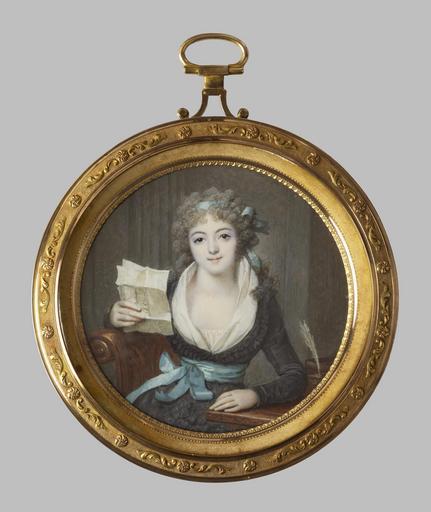 | Keywords: François Dumont - Mademoiselle de Montbrizon - Walters 38337.jpg Walters Art Museum artwork Creator François Dumont In this circular miniature Mlle de Montbrizon looks up from her desk with a letter in her hand Polite and expressive letter writing was a highly prized social accomplishment in 18th-century France In Paris the French capital notes and letters crisscrossed the city; by the mid-century there were up to nine deliveries of mail each day Although the sitter in this miniature is shown with a quill and elegant writing furniture we can tell from the way in which it is folded and addressed that she has received rather than written the letter she holds 1795 watercolor ivory Diam cm 7 62 ; Framed diam cm 10 16 accession number 38 337 581 Huntington Collection New York and California A Jay Fink Foundation Inc Baltimore date and mode of acquisition unknown inv no A-273 Walters Art Museum Gift of the A Jay Fink Foundation Inc in memory of Abraham Jay Fink 1963 signed at left Dumont F Jan 3 place of origin France Walters Art Museum license 3D François Dumont peintre 18th-century portrait paintings in the Walters Art Museum 1795 French paintings in the Walters Art Museum 1790s dresses 1795 paintings in the United States 1795 portrait paintings from France F 18th-century portrait miniatures of women 1795 18th-century portrait paintings of women at half length 1795 18th-century round portraits of women 1795 18th-century watercolor portraits of women 1795 18th-century women of France 1795 Chairs in portrait paintings 1795 Female hair fashion in art 1795 Females with black dresses in art 1795 Painting frames Portraits with letters 1795 Quills in portrait paintings 1795 Tables in portrait paintings 1795 Waist sashes in art 1795 Portrait miniatures in the Walters Art Museum |