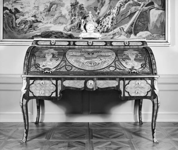 | Keywords: François-Gaspard Teuné - Roll-Top Desk Depicting the Chateau of Saint Maur - Walters 6588.jpg This form of desk with its counter-weighted receding top became fashionable in 1760 when a similar desk was commissioned for Louis XV This example is attributed to Teuné a specialist in such desks who became a master ébéniste cabinetmaker in 1766 Portrayed in the marquetry of the top is a perspective of the Ch teau de Saint Maur a residence of the prince of Condé The ch teau situated in what is now St Maur-les-Fosses was demolished during the French Revolution ca 1770 oak carcass body various woods marquetry ivory inlay bronze-gilt mounts cm 43 82 w accession number 65 88 40793 Madame Bacri Paris Walters Art Museum March 1974 by purchase Museum purchase 1974 place of origin France Walters Art Museum license Cylinder desks 1770 about Marquetry Château de Saint-Maur François-Gaspard Teuné Furniture in the Walters Art Museum |