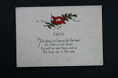 | Keywords: Frank Yates Hirst, item 113.jpg Frank Yates Hirst emigrated to Canada in 1911 He was a farmer and the winters were so cold that he moved to Springfield Massachusetts He was still there when America joined the First World War so he was conscripted into the American army and made an American citizen On August 22nd 1918 he set sail in a convoy He started a diary during the voyage which he continued until his return to England He starts with details of the convoy and the crossing He was very happy to be sailing home to England He arrived in Liverpool and then went to Winchester and on to Southampton He crossed on a very crowded boat to Le Havre His company moved to the Bordeaux area to Pons He was not involved in any fighting and the diary gives lots of details about his daily life His belongings include photos of his base in America exhibition history object history object type Europeana 1914-1918 Copyright information Europeana 1914-1918 PD-own upload Europeana claims no rights in its digitisation in accordance with its http //pro europeana eu/publications/the-europeana-public-domain-charter Public Domain charter Europeana 1914-1918 project place of creation place of discovery http //www europeana1914-1918 eu/en/contributions/3193 Frank Yates Hirst item 113 Uploaded with GWToolset Frank Yates Hirst item 113 http //www europeana1914-1918 eu/attachments/46082/3193 46082 full jpg 1918 postcards Western Front theatre of World War I |